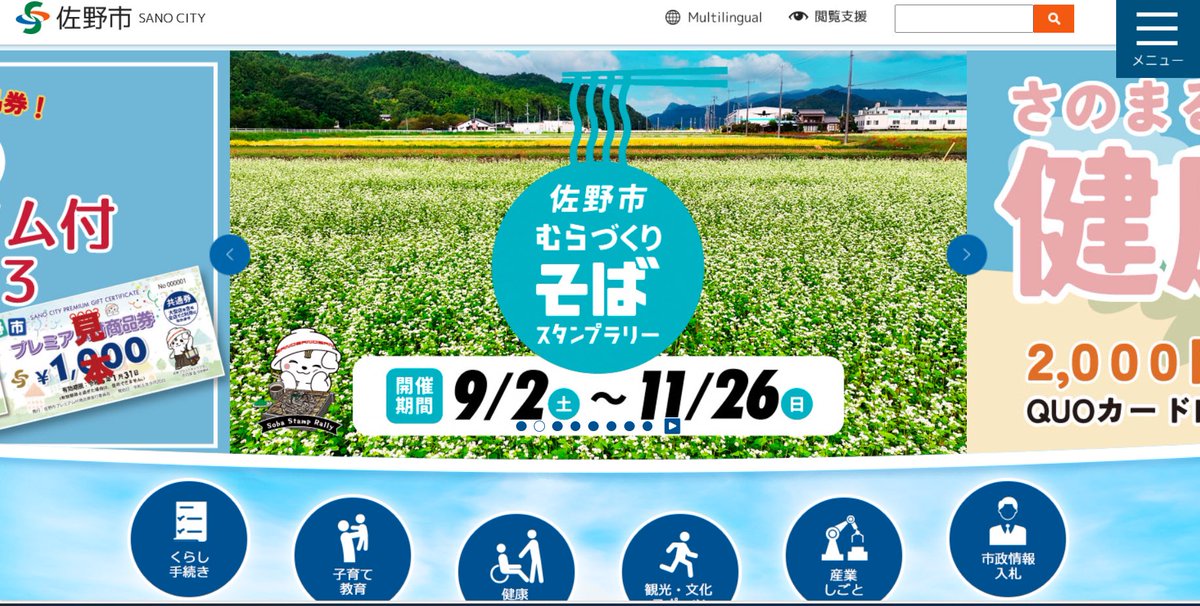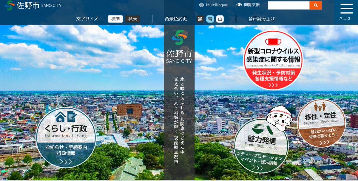 閲覧支援タブもありウェブアクセシビリティにも対応、ページを開くとところどころにさのまる!