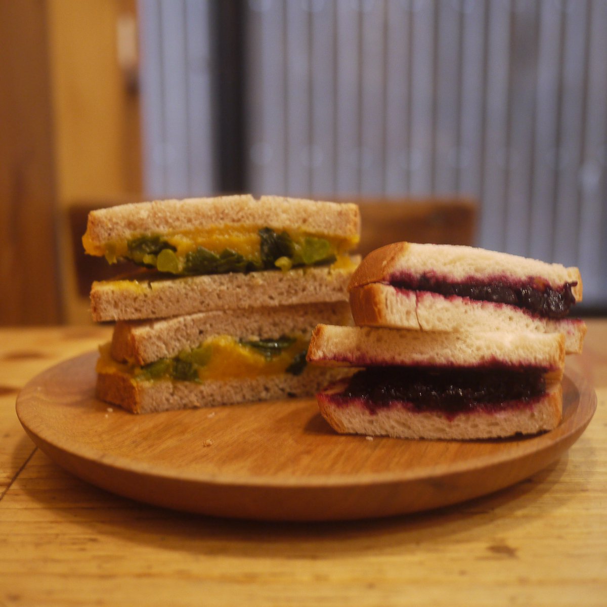 スペルト小麦の食パンサンドは、ツルムラサキのオイル蒸しにバターナッツペーストサンド&ブルーベリージャムサンド。