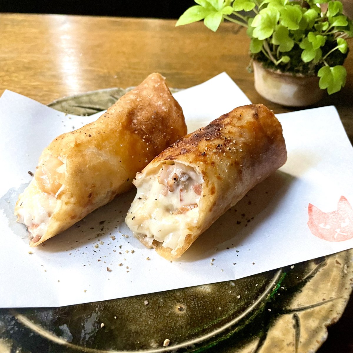 「燻製ホタテのクリーム春巻き」750円。桜のチップで燻製したホタテ貝を、ベーコンやマッシュルーム入りのベシャメルソースと一緒に、春巻きの皮で包んで揚げました🐈🐈🐈