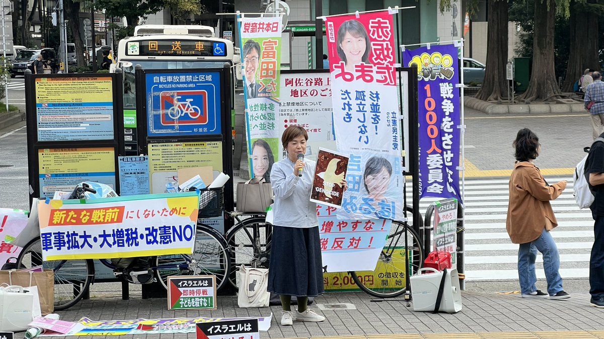 阿佐ヶ谷駅南口での「戦争やめろ!子どもたちを殺すな!」阿佐ヶ谷駅頭大街宣に参加中。