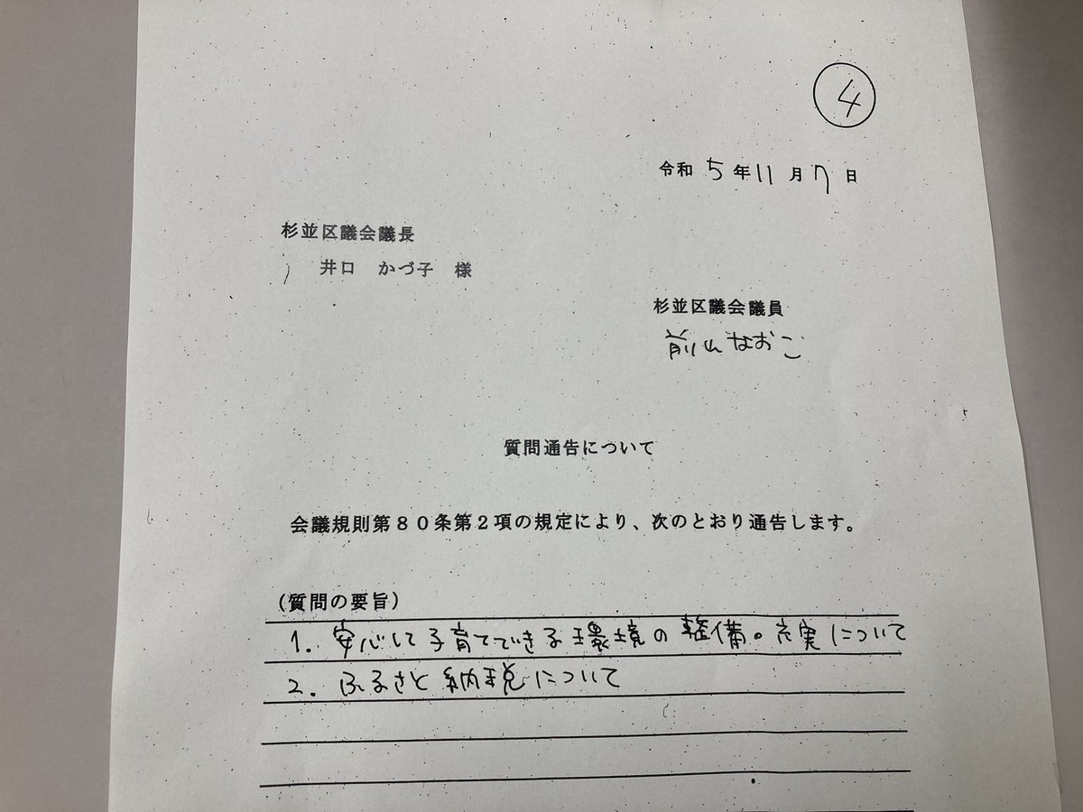 今日の13時から質問通告があり9人で質問順のくじ引きをしました。わたしは4番🙋♀️初日の最後か2日目の午前中予定です。質問日時が決まりましたらまたお知らせします。