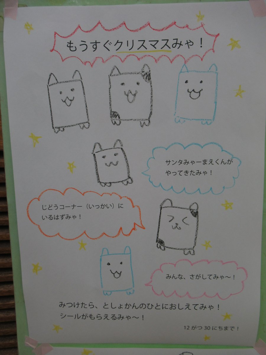 今月は「みゃーまえくんをさがせ!」を行っています。1階児童コーナーのどこかに隠れているサンタみゃーまえくんを見つけるとシールがもらえます。ぜひお子さまはチャレンジしてみてください!