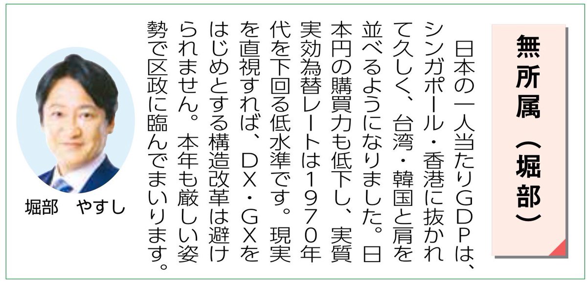 日本の一人当たりGDPは、シンガポール・香港に抜かれて久しく、台湾・韓国と肩を並べるようになりました。日本円の購買力も低下し、実質実効為替レートは1970年代を下回る低水準です。現実を直視すれば、DX・GXをはじめとする構造改革は避けられません。本年も厳しい姿勢で杉並区政に臨んでまいります…