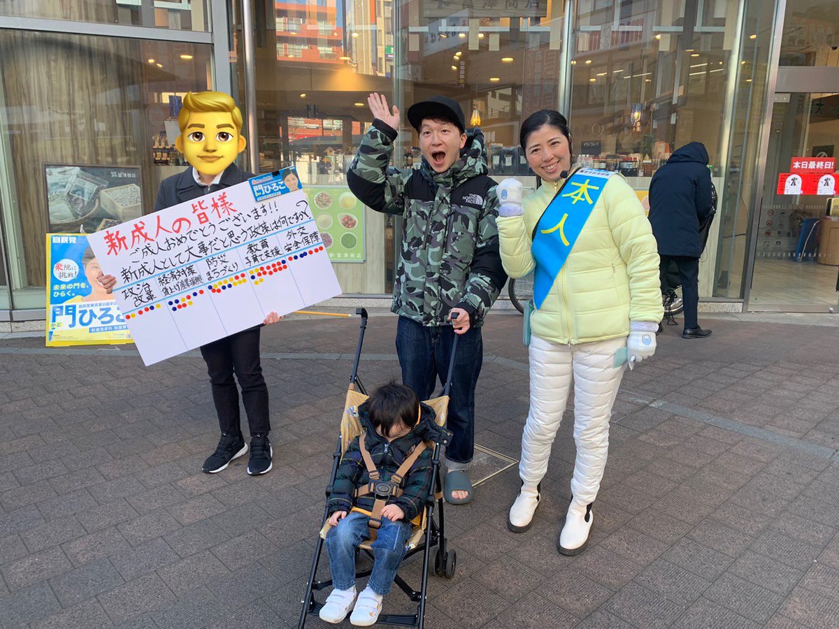 二十歳のつどいへ向かう若者に挨拶をする #門ひろこ @HirokoKado さん。 『会場前に居座ると主役の若者たちの邪魔になる』、と朝からずーっと荻窪駅前にいたそうだ。 私は家庭の事情で長男との買い出し途中に激励のみ。 ※私はこの30分後に式典参列。 #杉並区 #東京8区 #荻窪