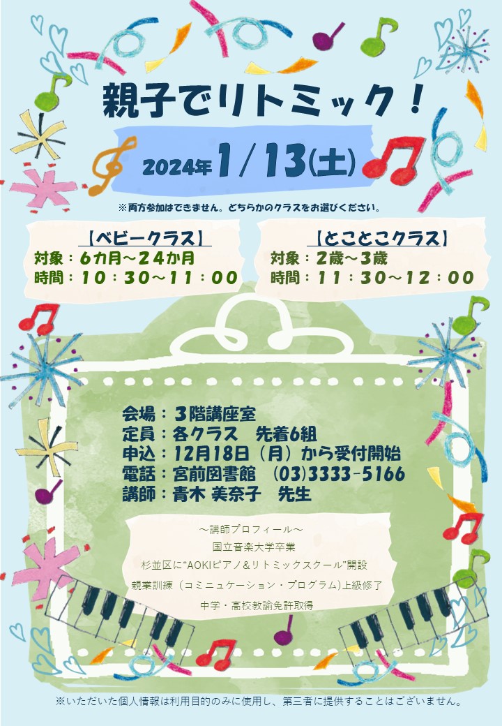明日1/13(土)に行う「親子でリトミック!」は、対象2歳から3歳のお子さまの回にまだ席がございます。ぜひお子さまとご一緒にいかがでしょうか。みなさまのお申込みをお待ちしております。