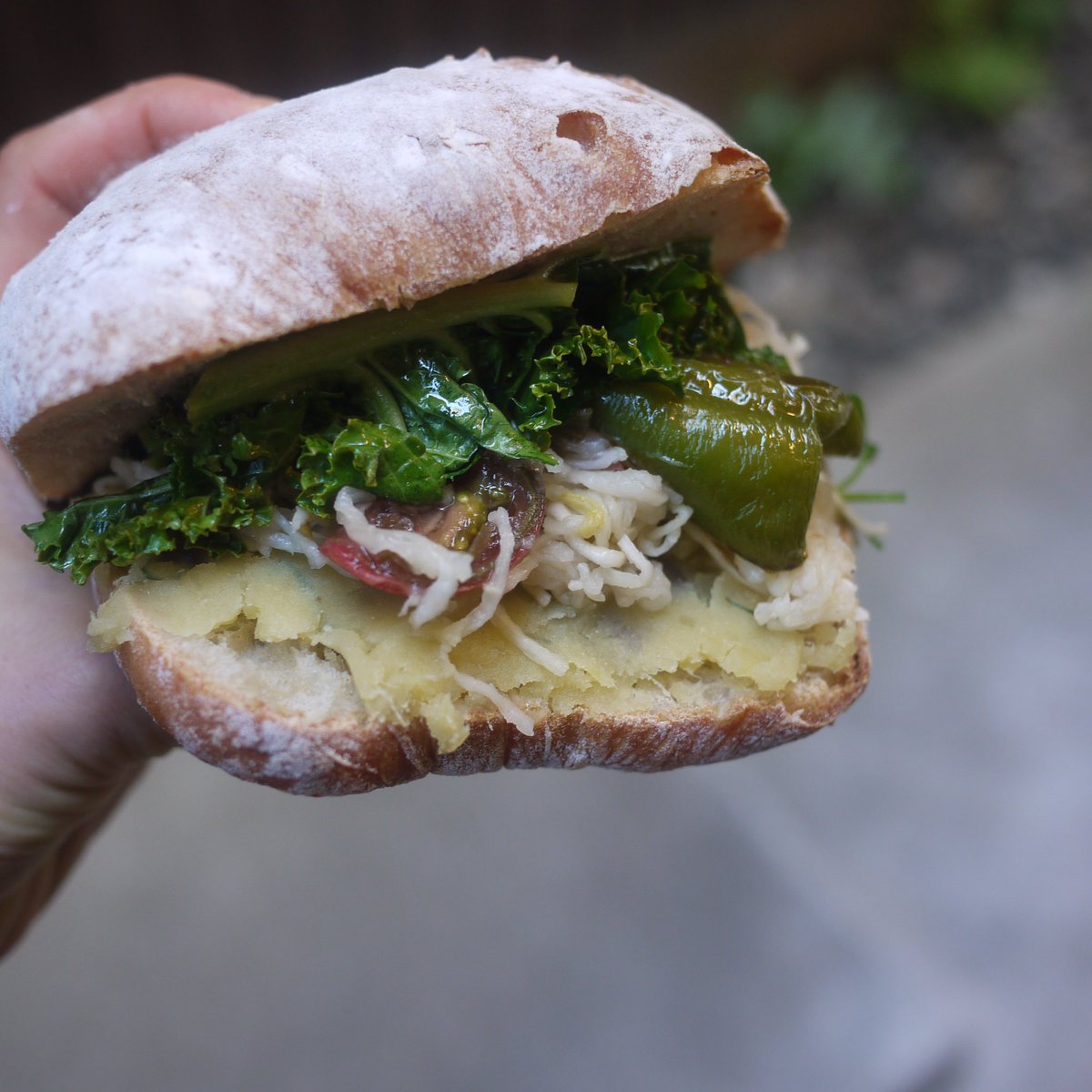 スペルト小麦のチャバタサンドは、トマトと切り干し大根のサラダ、ケールソテー、ピーマン焼き、さつまいもディル入りポテサラ。