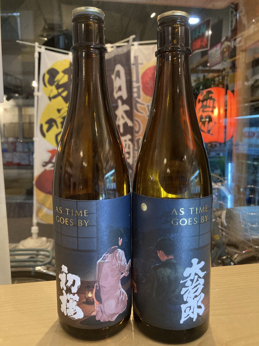 以前京都で入手した、初桜の安井酒造場さんと、大治郎の畑酒造さんのコラボ企画熟成酒AS TIME GOES BYをお店に飾ってます!素敵なデザインですよね😌