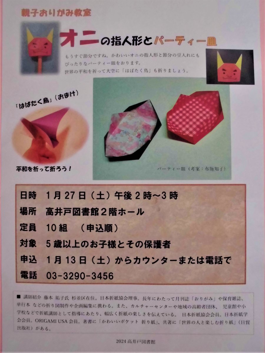 1月27日(土)に「親子おりがみ教室」があるよ!