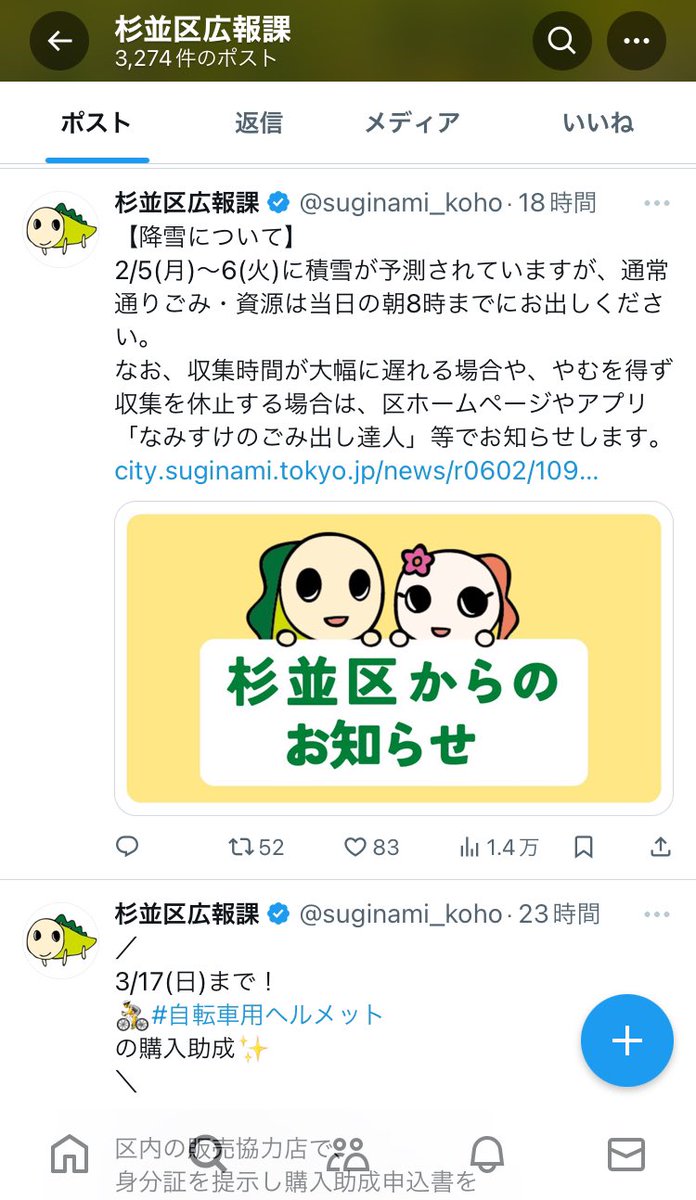 昨日の杉並区の降積雪についてSNSの発信が足りないのではないか。区民の方からも声が届きました。 23区を見比べると区公式や危機管理、災害など別アカウントや区長からの発信があるところが殆どでした。 昨年2/10の大雪警報の際には区のSNSが発信していたので担当部署に改善を要望しました。 #杉並区