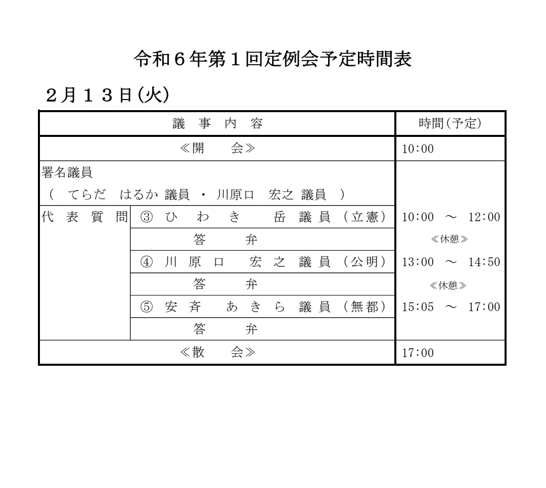 本日の日程を教えてほしいとたくさんの方から要望がありましたので、予定表を掲載します。(議員に当日の朝送付されるもので、あくまで大まかな予定です。)