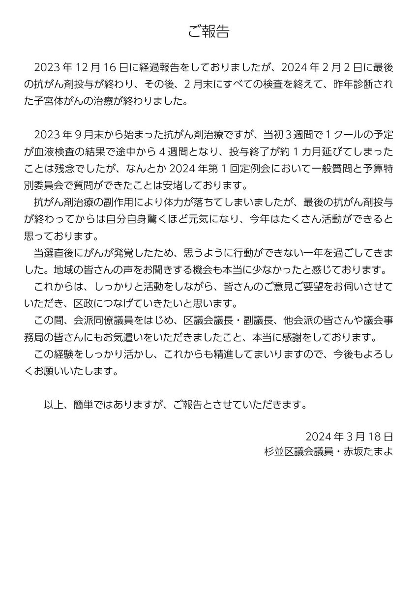 本日3月18日、2024年第1回定例会が終了しました。今定例会は、一般質問、予算特別委員会でも質問をすることができました。 昨年8月に手術した子宮体がんは、抗がん剤投与も終了し、ようやく体力も回復してきました。ご報告という形で記しましたので、ご一読いただけたら幸いです。 #赤坂たまよ