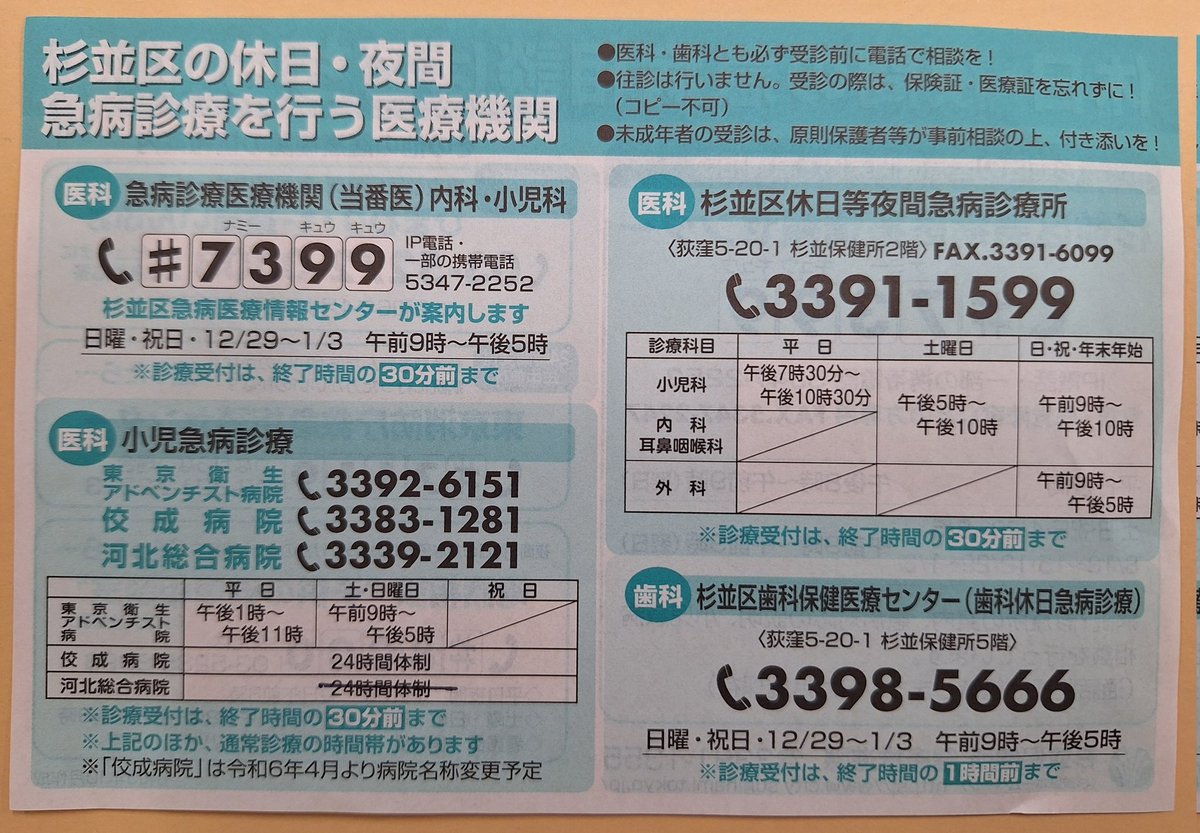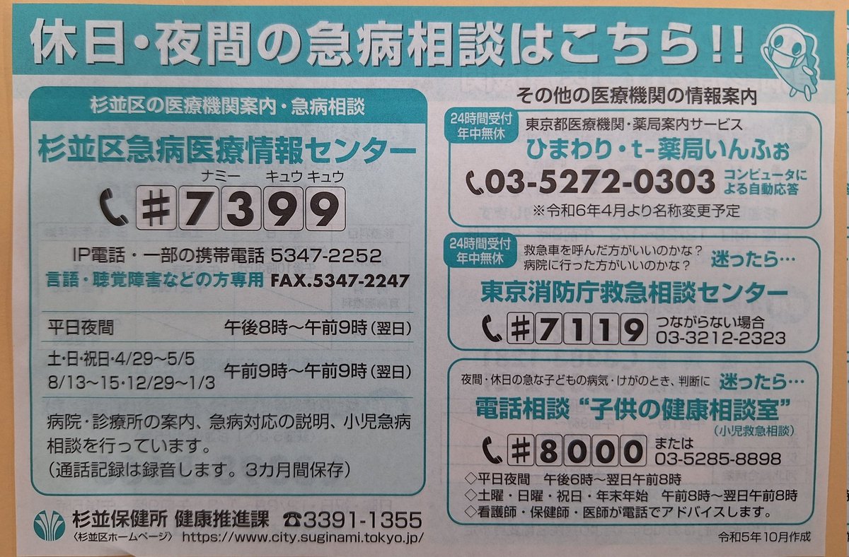 河北総合病院の小児科の診療体制が縮小し、4/1から24時間体制ではなくなりました。病院のHPと区のHPにお知らせが出ていますが、区報でも4/15号でお知らせするとのことです。また、保健所や子ども子育てプラザなどに置いてあるこの小さなチラシも4月中に修正配布するそうです。 kawakita.or.jp/suginami-area..