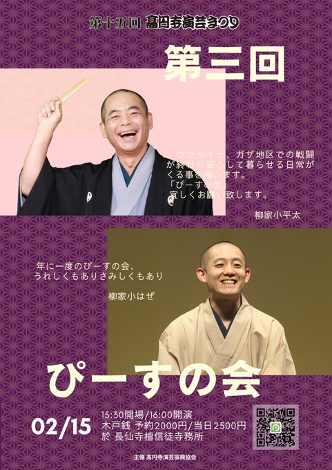 \年に一度の仲良し二人会/第三回ぴーすの会2月15日16:00開演於長仙寺檀信徒寺務所小平太さんと小はぜさんの会は3回目小はぜさんが始まる前から寂しくなっていらっしゃる…柳家の至芸とほっこりな雰囲気を..