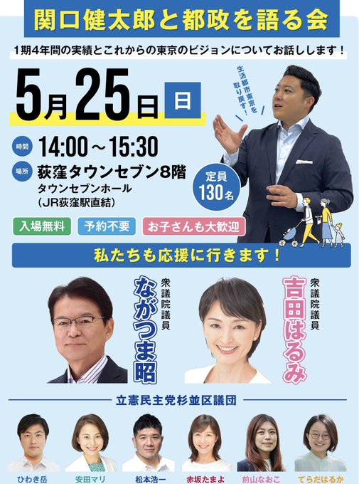 本日開催!関口健太郎と都政を語る会-特別編-5月25日14:00-荻窪タウンセブン8Fにて!急遽、岸本聡子区長、おくむらまさよし参議院議員も応援に駆けつけてくれることになりました!もちろん、長妻さん、..