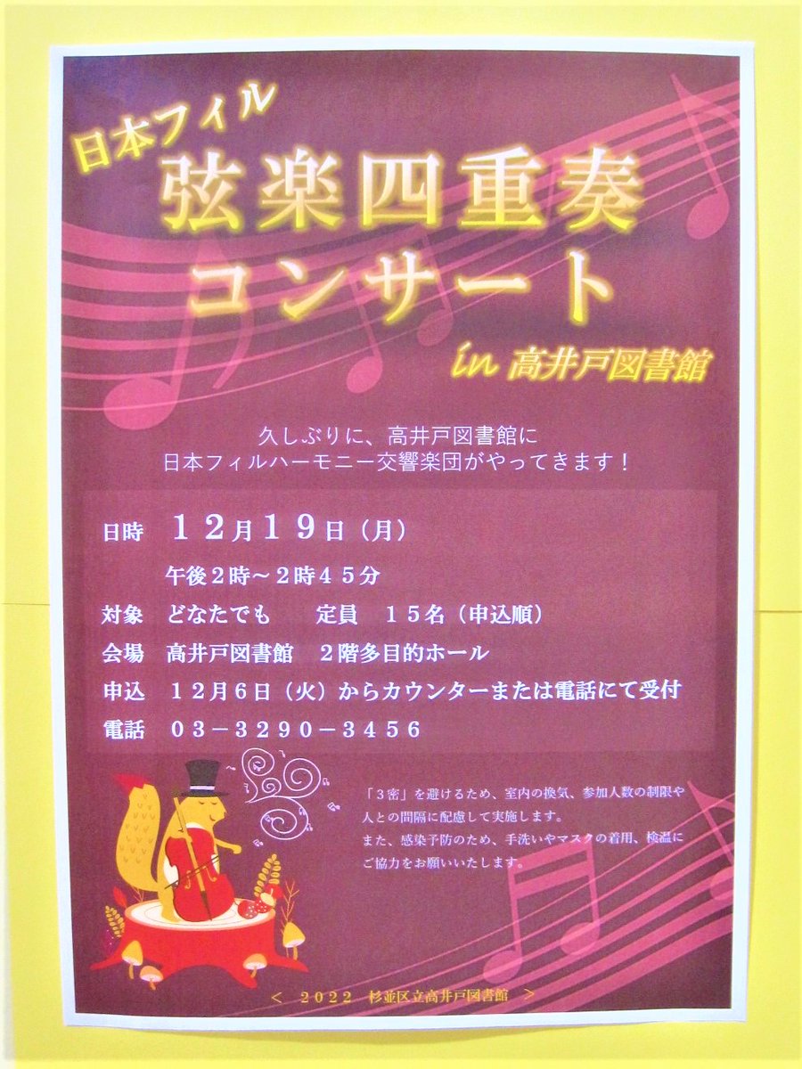 <どうも!タカどんです!! 今日(19日)は8時まで開館しています! 2時からは #日本フィルハーモニー交響楽団 の #弦楽四重奏 コンサートがあります!(満員御礼) 館内にいたら音楽が聞こえてくるかもしれません(`・ω・´)b 楽しみ~(*´ω`*)