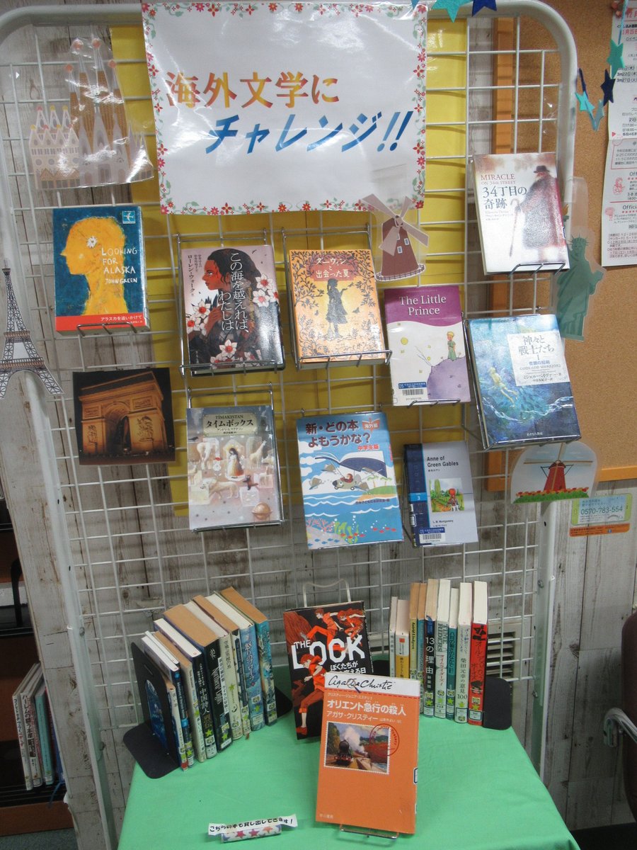 【図書館】おはようございます。12/19(月)は夜8時までの開館です。 今月のYAコーナーでは、「海外文学にチャレンジ!!」というテーマで展示を行っています。海外文学が好きな方も、手を伸ばしたことがない方も、ぜひご覧ください☆