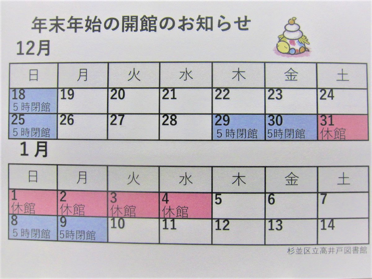 <どうも!タカどんです!今日(20日)は8時まで開館しています!2階の臨時閲覧席も開いていますよ~年末年始の開館カレンダーをカウンターで配っていまーす\(^o^)/000