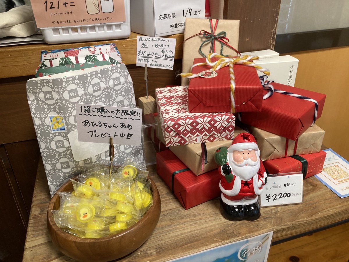 小杉湯の待合室では、クリスマスマーケットを開催中!出店していただいているお店をご紹介!盛田商店@morimoripi可愛いイラストが描かれたステッカーやTシャツ、トートバッグ、手ぬぐいまで!富士山のふ..