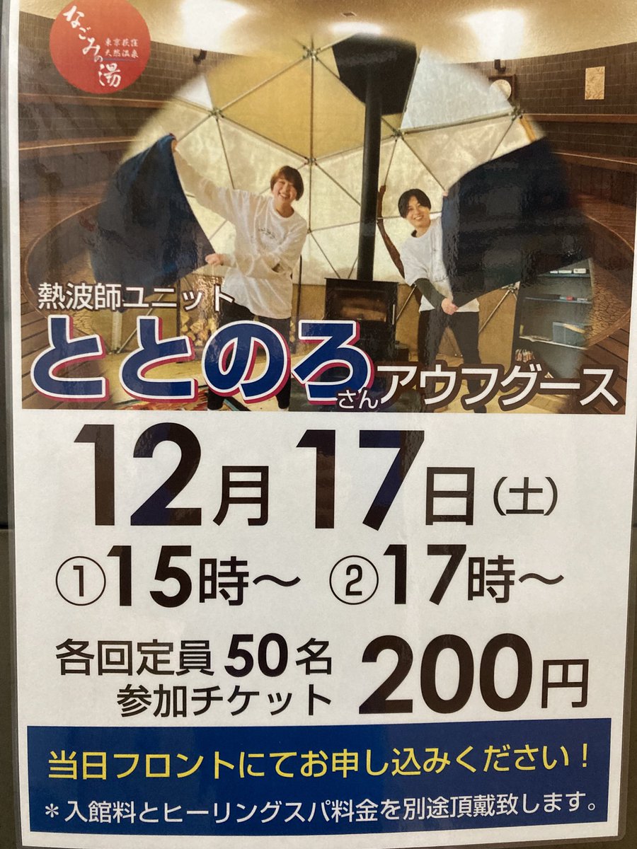 今日と明日は、ゲストによるアウフグースイベントを行います。2組とも今年最後の出演です。どうぞお楽しみに!#なごみの湯#ととのろ#じゃが0019