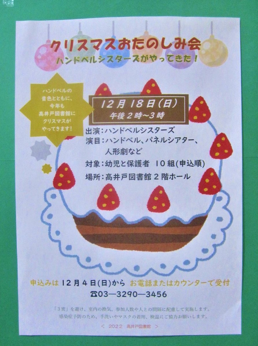 どうも!タカどんです!今日(18日)は日曜日なので5時までの開館です。クリスマスおたのしみ会(満員御礼)が2時からあります。ハンドベルの音色が館内にやさしく響いて、クリスマスの雰囲気ですよ~(*´ω`..