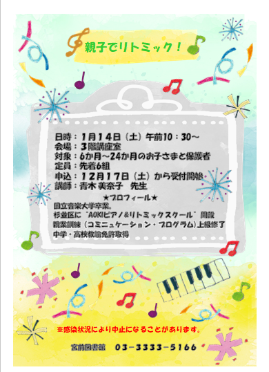 【図書館】本日12/18(日)は夕方5時までの開館です。 ただいま2023年1月14日(土)開催の「親子でリトミック!」の予約受付を行っております。お電話または、カウンターにてお申込みください。ご参加をお待ちしております♪