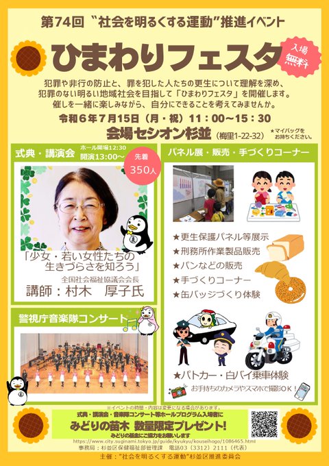 /7月は「#社会を明るくする運動」強調月間「#ひまわりフェスタ」を開催します!\7/15(月・祝)11:00~15:30セシオン杉並講演会「少女・若い女性たちの生きづらさを知ろう」講師:村木厚子氏(当..