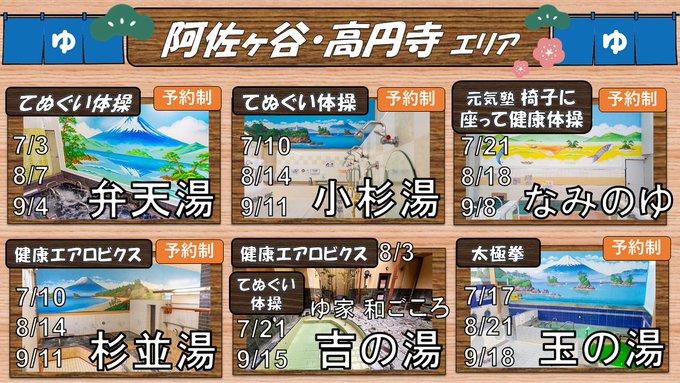 /身近なまちの#お風呂屋さんで楽しく健康づくりをしませんか♪\杉並区内在住で60歳以上の方を対象に、区内の銭湯で「てぬぐい体操」や「太極拳」、「エアロビクス」などの健康事業を実施しています★参加無料!..