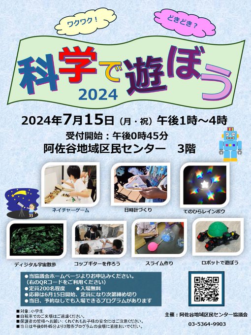 ワクワクどきどき科学で遊ぼう2024!日時計、コップギター、スライム、レインボウスコープ等の作成やネイチャーゲーム、ロボット操縦、デジタル宇宙散歩など行います!(一部事前申込有)7/15(月・祝)13..