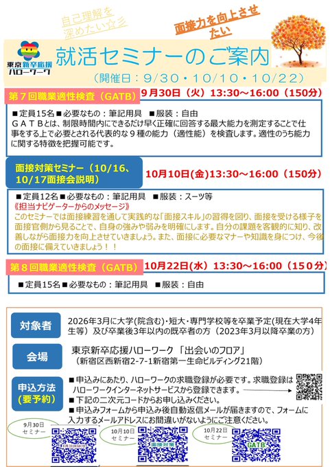 就活セミナーのお知らせ 明後日10月10日(金)開催のセミナー、締切間近です! 面接対策セミナー 面接練習を通して実践的な「面接スキル」の習得を図り、面接を受ける様子を面接官側から見ることで自身の強み弱みを明確にするセミナーです! 申込はこちらから https://jsite.mhlw.go.jp/tokyo-hellowork/kyushokusha/tokyo_shinsotsu/event/1010.html…