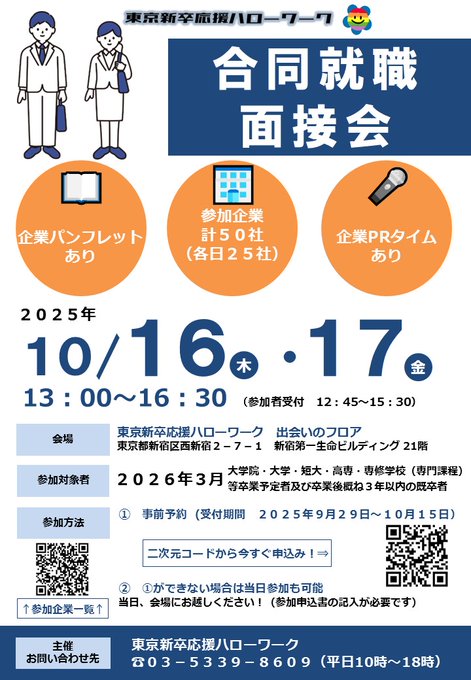 合同就職面接会のお知らせ 10月16日・17日 東京新卒応援ハローワーク合同就職面接会 2日間合計で50社が参加 2次元コードから気になる参加企業をチェック #26卒 #新卒採用 #大学生と繋がりたい #就活生