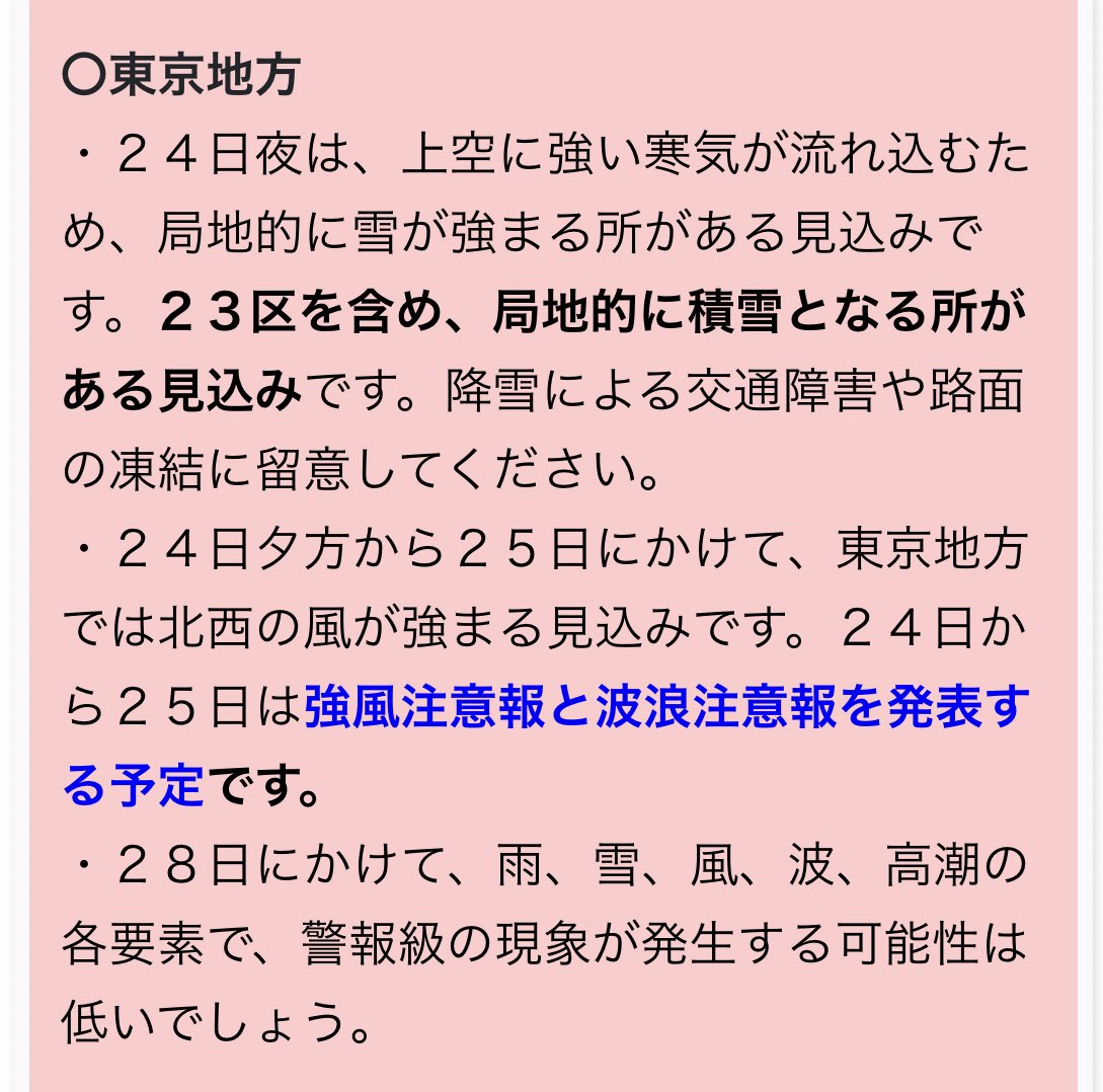 今日(24日)夜は、上空に強い寒気が流れ込むため、局地的に雪が強まる所がある見込みです。東京23区を含め、局地的に積雪となる所がある見込みです。降雪による交通障害や路面の凍結にご注意ください。明日6時までの予想降雪量は多い所で2センチ。
