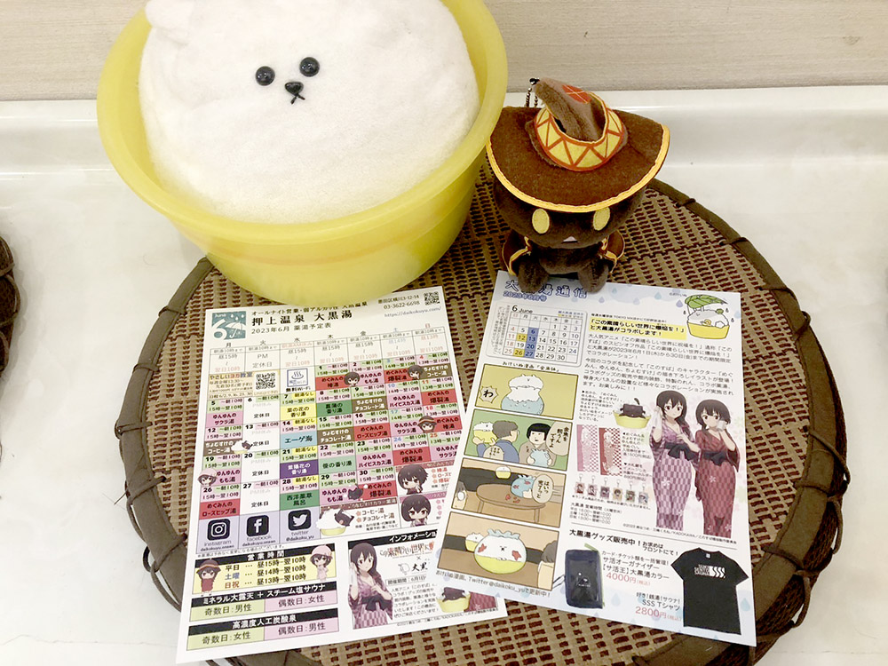 フロントで配布している薬湯予定表には「このすば」コラボの記事が載ってますよ😊記念にお持ち帰りください💕