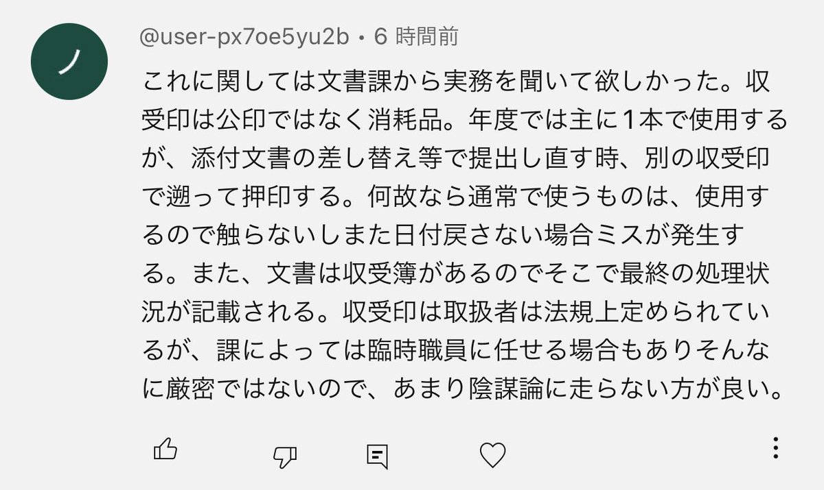 私は通常の事務作業を聞き取り調査した上で、このハンコの理屈が読み解けない。添付文書へ追加などがあったとしても、間違いなく言えるのは6月の収受印が押され、作成日も6月になっている事。