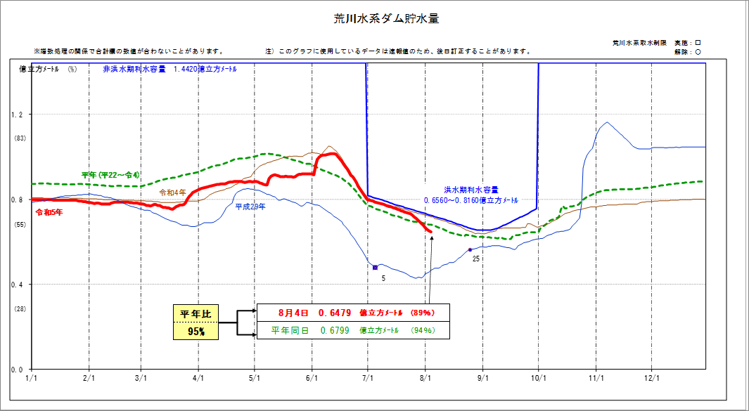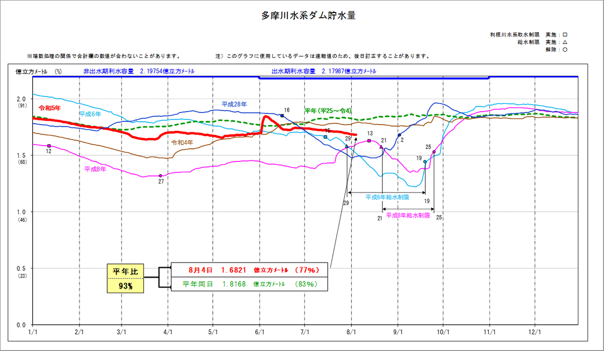 【水道局・水源情報】8月7日現在の各水系ダム貯水率は、利根川水系63%、荒川水系86%、多摩川水系77%です。利根川水系では貯水率低下に伴い、渇水対策連絡協議会幹事会が本日開催されました。今後の気象状況によっては、更に低下が見込まれます。引き続き、節水にご協力のほどよろしくお願いします。