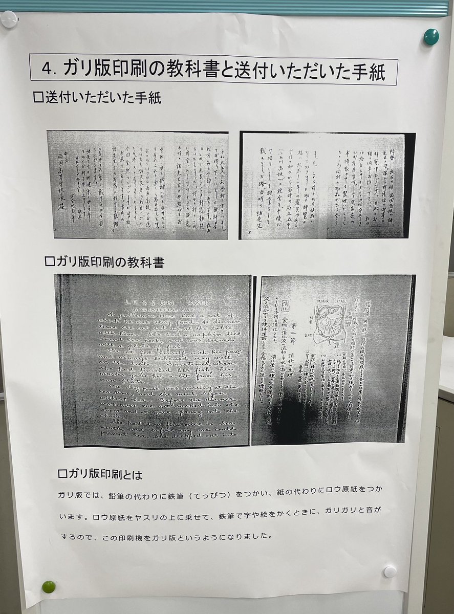 OB(淡交会)の展示コーナーでは、100年前の関東大震災で校舎・教材が焼失した中で、教師が自らガリ版刷りのプリントをつくり翌月には焼失を免れた他校の校舎を借り授業を再開した歴史が紹介されてました。