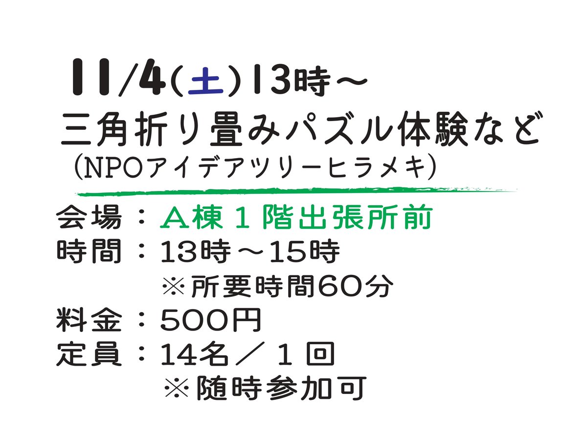 11/4(土)13時~ 会場 A棟1階 出張所前 500円