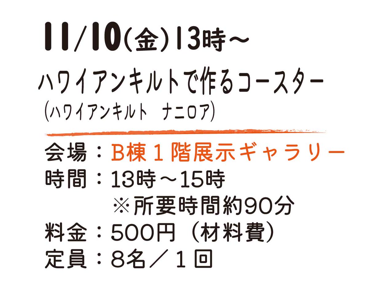 【#ユートリヤ祭 体験WS】 ユートリヤ祭は舞台・展示を楽しめるほか体験もあります🙌順番にご紹介☆彡 お持ち帰りできます🌺 / ハワイアンキルトで作るコースター(ハワイアンキルト ナニロア) 11/10(金)13時~ B棟1階 展示ギャラリー 500円(材料費) \ ※事前予約制。詳細・予約はユートリヤ迄☎️