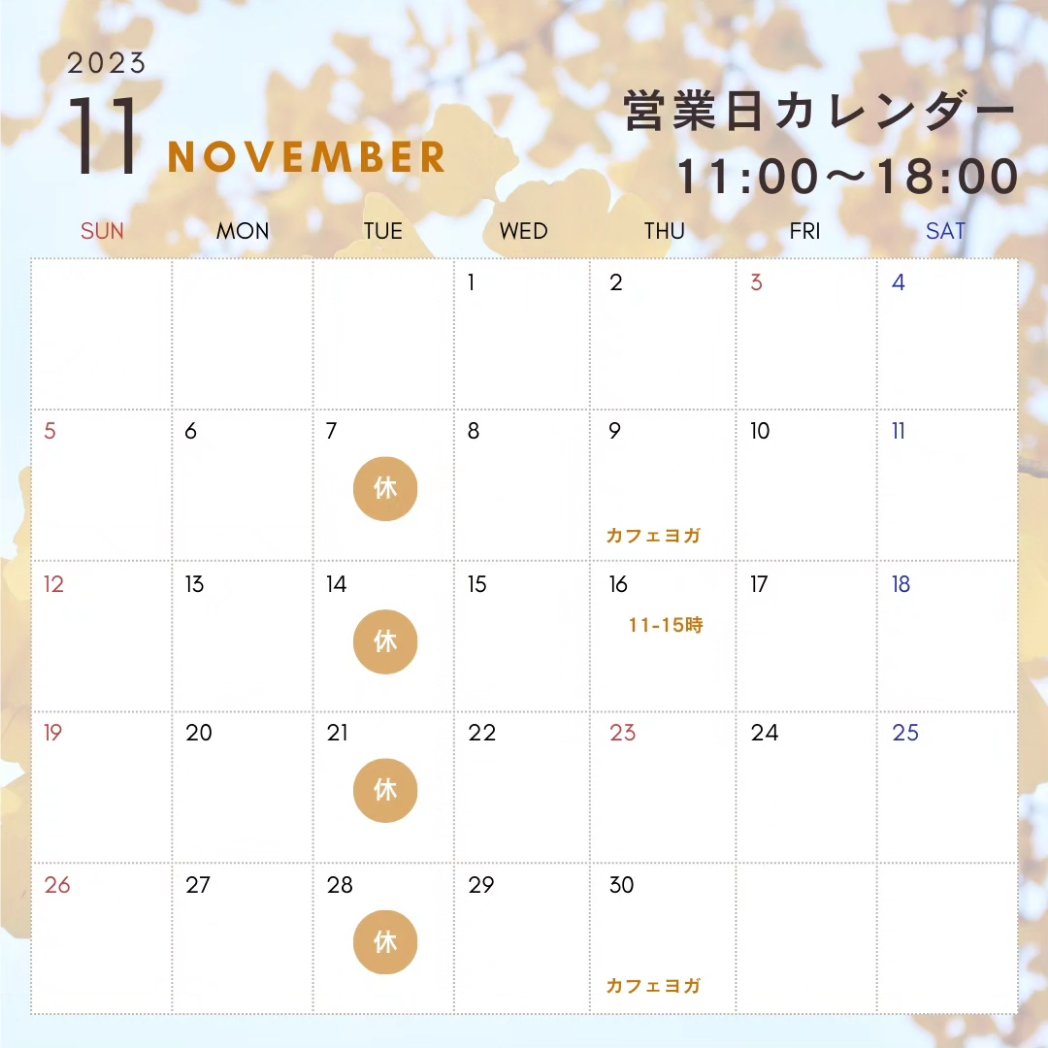 また、11/9、30にカフェヨガイベントの予定です。詳細は、instagram.com/unasato_yoga