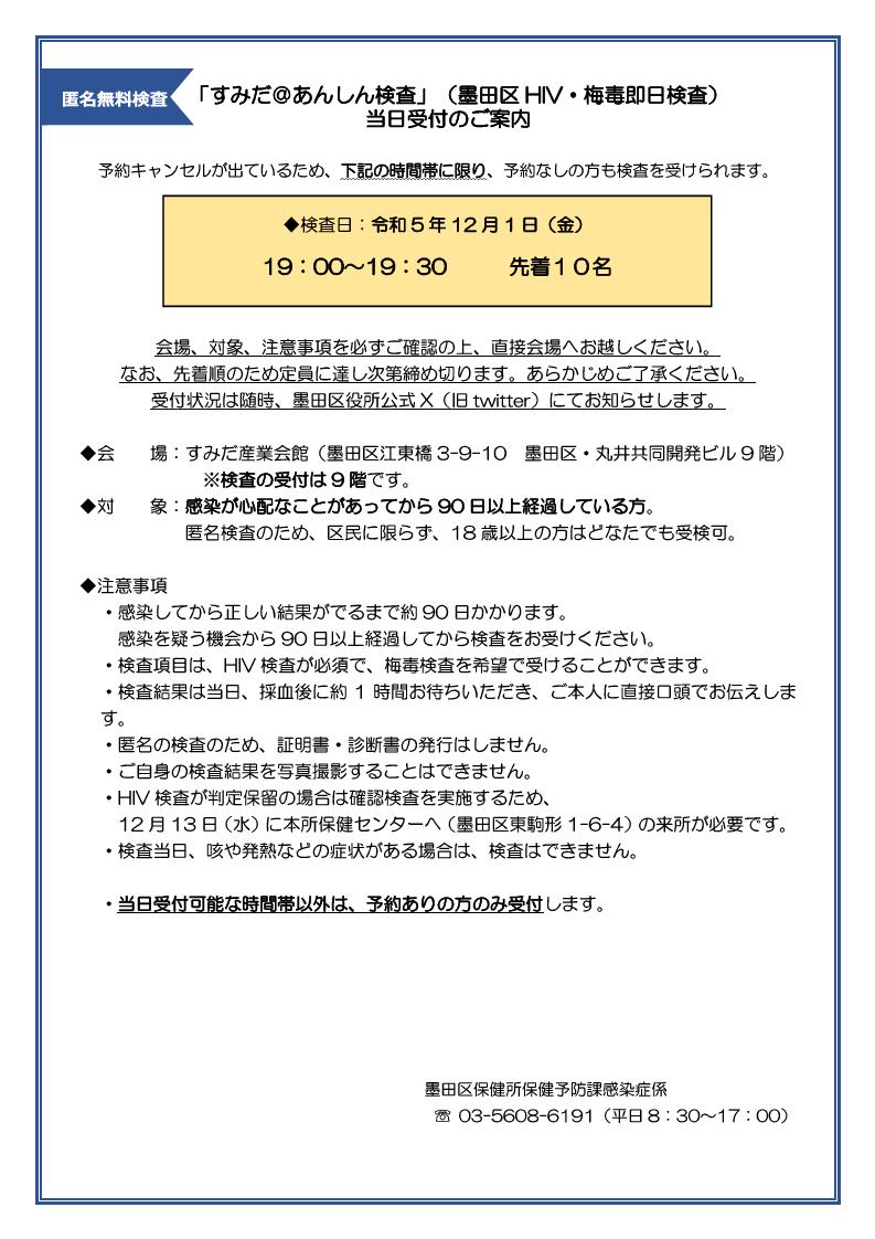 【📢先着10名!予約不要で検査】12/1にすみだ産業会館9階で、すみだ@あんしん検査(#HIV #梅毒 即日検査)を実施します!予約キャンセルが出たため、19:00~19:30に先着10名の検査を受付けます。定員に達し次第締め切ります。添付画像をご覧ください。