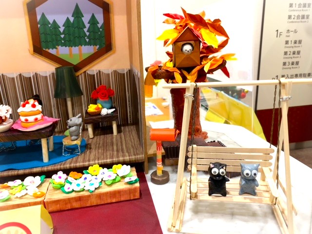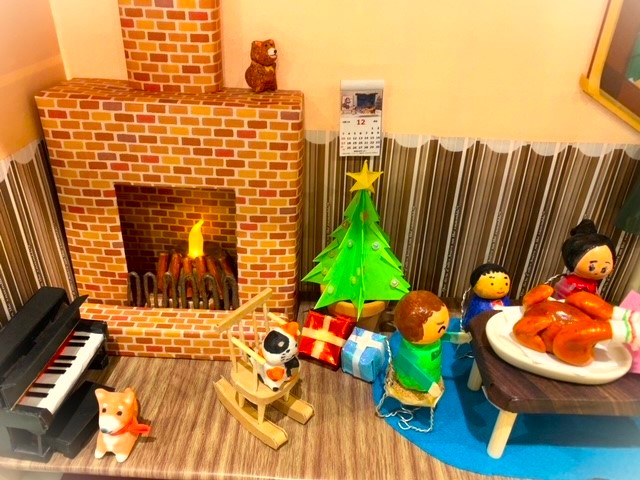 今回の季節のしつらえのテーマは「おうちでクリスマス」。 お部屋にはツリーとプレゼント、七面鳥の丸焼きにケーキ。屋根にはサンタさんもいます。