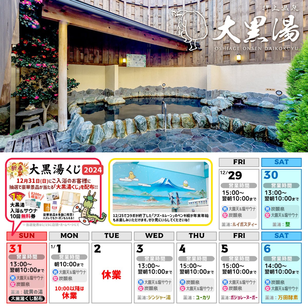 12/31(日)はご入浴のお客様に豪華景品が当たる「大黒湯くじ」を配布!ぜひご来店くださいませ✨