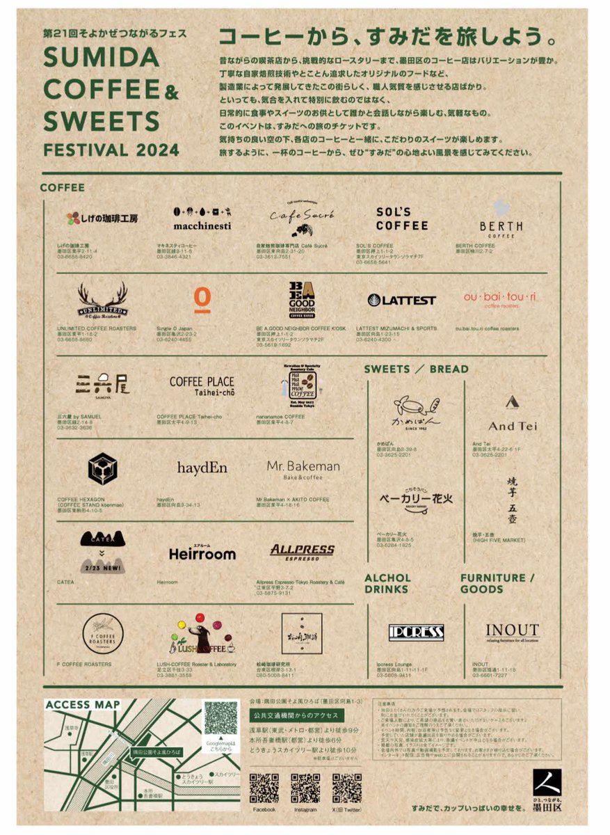 #イベント2/24(土)、「Sumida Coffee&Sweets Festival2024」が開催されます☕️🍪すみだモダン認証事業者「しげの珈琲工房」をはじめとする墨田区のコーヒー店、スイーツ・パン店など28店が隅田公園そよ風ひろばに集います☺️