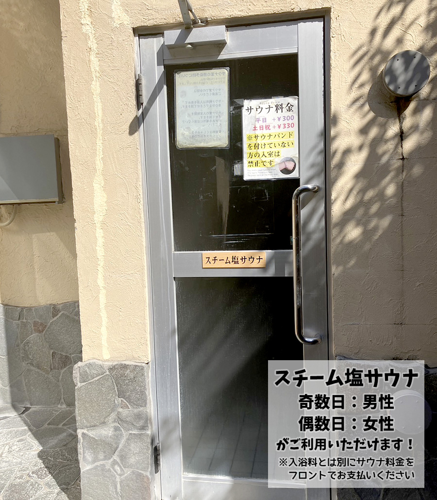 スチーム塩サウナは奇数日=男性、偶数日=女性の日替わりです。ぜひ入りにいらしてくださいね😊