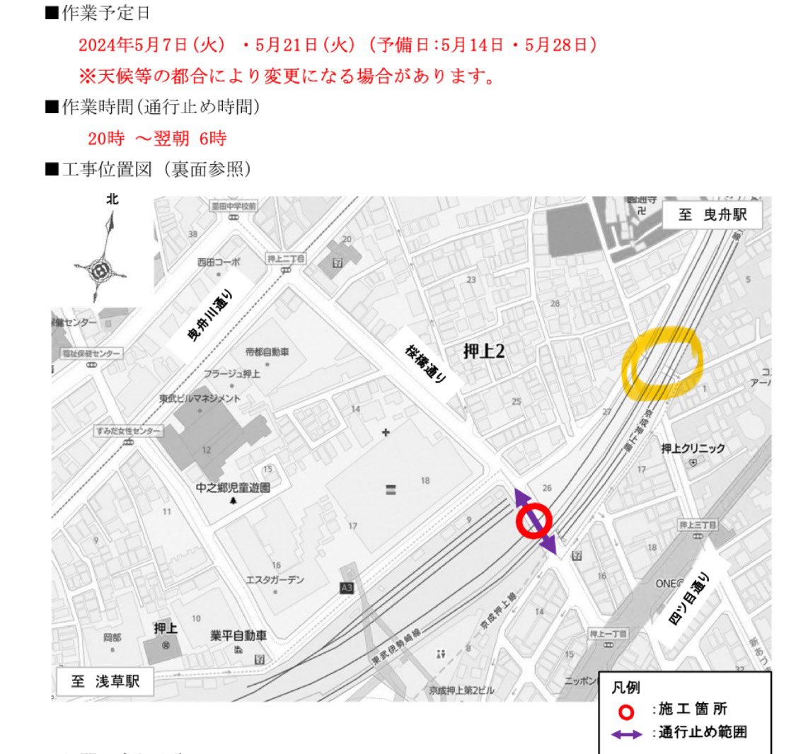 連休明けの7日(火)は、夜8時〜翌朝6時まで、#桜橋通り にかかる東武線踏切は車両・歩行者ともに「 #通行止め」になりますのでご注意ください!…