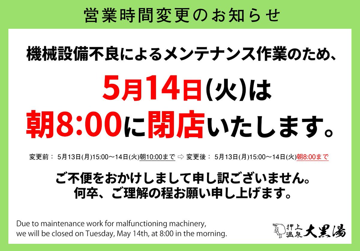 5/14の朝はいつもより2時間早く閉店いたしますので、お間違いのないようご注意くださいませ。…