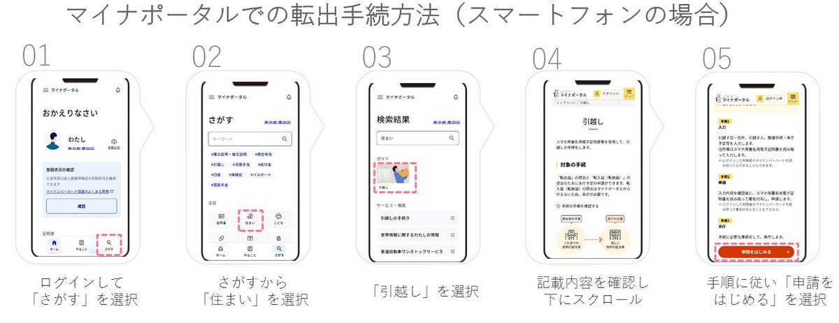\区役所に来なくてもできる"引越し手続き"あります/ マイナンバーカードをお持ちの方は「マイナポータル」から墨田区外に引っ越す際の「転出届」がオンラインで手続き可能です!該当の方は添付画像をご参考にしていただき、手続きしてみてください。 ☆詳細はこちら☆ https://city.sumida.lg.jp/kurashi/todokede_syoumei/tenshutsunyu_oss.html…