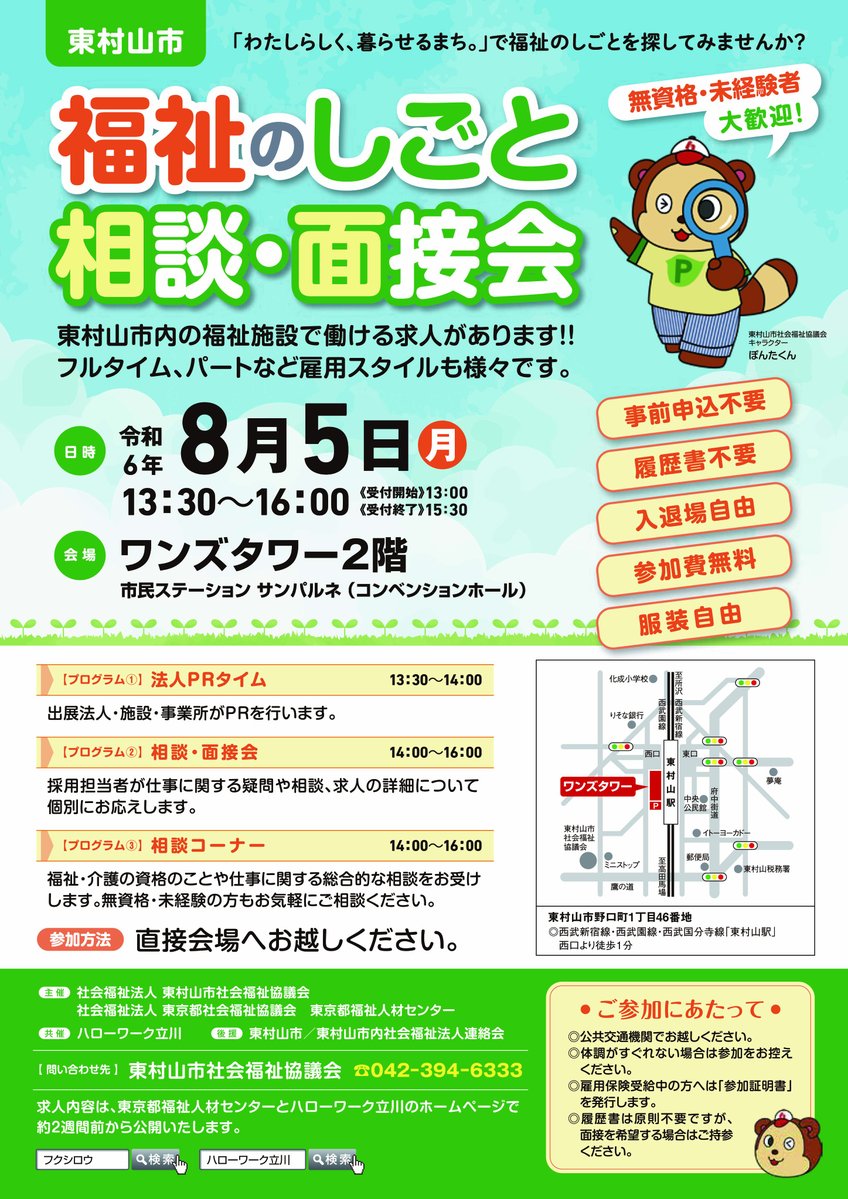【東村山市「福祉のしごと相談・面接会」開催】 「地元で福祉の仕事がしたい」を応援します! 令和6年8月5日(月)/13:30~16:00/ワンズタワー2階 ■ 求人概要は、東京都福祉人材センターのホームページで約2週間前から公開します。 HP:https://tcsw.tvac.or.jp/jinzai/sodankai.html…