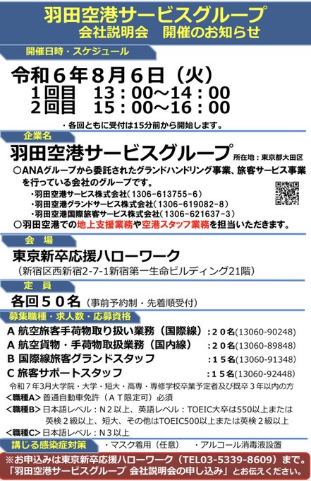 イベントのお知らせ 8月6日(火)13:00〜 【羽田空港サービスグループ】 ANAグループから委託されたグランドハンドリング事業、旅客サービス事業を行っている会社のグループです 羽田空港での地上支援業務や空港スタッフ業務 #就活生 #25卒と繋がりたい