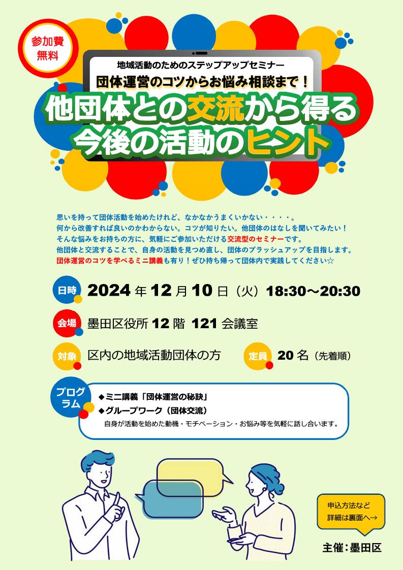 【受付終了まであと1日】 #地域活動のためのステップアップセミナー 12/10(火)18:30~20:30 参加費無料 子育て、生きがいづくり、居場所の提供など、様々な分野から参加予定★ #墨田区 #地域活動 #ボランティア #交流会 https://city.sumida.lg.jp/eventcalendar/kankyo_chiiki/jinzaiikusei2024.html…