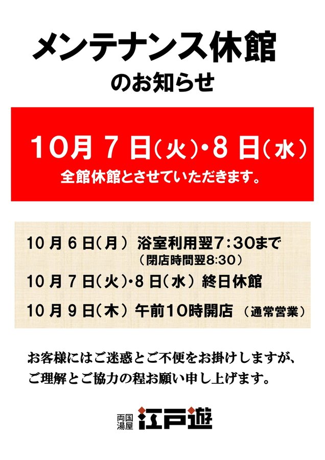 大黒湯、本日10/21(火)は定休日になります。お間違いのないようご注意くださいませ。明日、10/22(水)は15:00より営業スタートですお待ちしております☺️